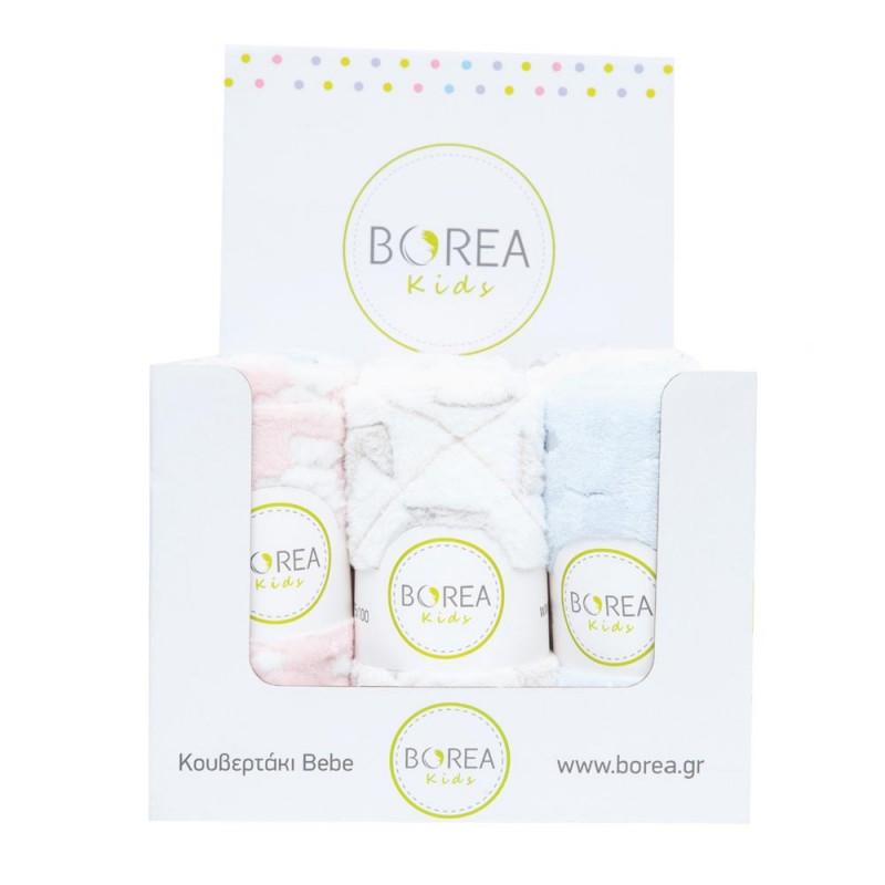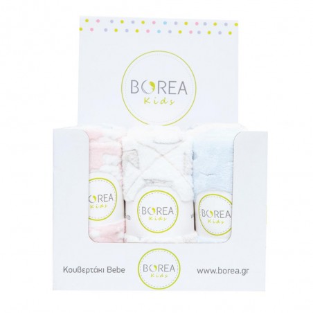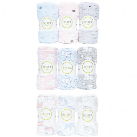 Εννέα κουβερτάκια αγκαλιάς από ύφασμα φλανελ, 100% πολυέστερ, σε 3 σχέδια και 3 χρώματα σε κουτί προώθησης.