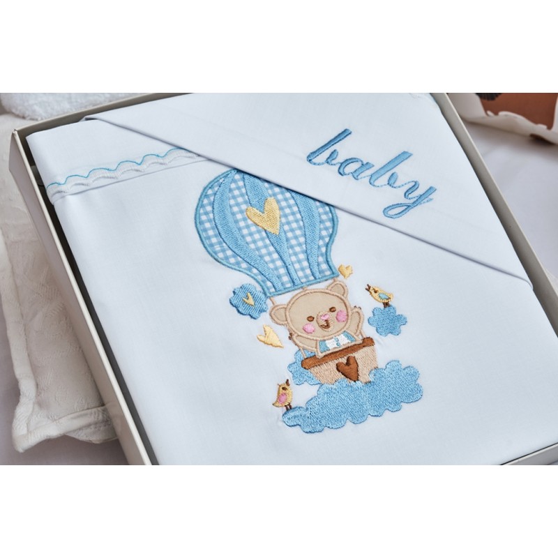 Σετ Βαμβακερών λευκών Σεντονιών για βρέφη, με κέντημα αερόστατο για να ταξιδεύει το μωρό σας στην παραμυθοχώρα. Υποαλλεργικά κι απαλά για να είστε ξέγνοιαστοι ότι απολαμβάνουν ύπνο γεμάτο υγεία.