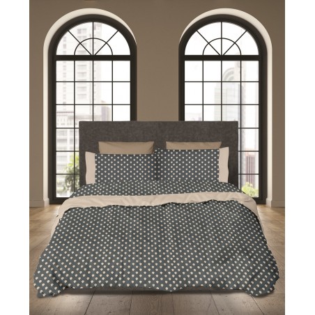 Σετ παπλωματοθήκη με φερμουάρ υπέρδιπλη με μαξιλαροθήκες oxford style από ύφασμα βαμβακοσατέν, 205 κλωστών, 100% βαμβακερό, εμπριμέ, με γεωμετρικό μοτίβο, σε χρώμα γκρι, με διακοσμητική φάσα και κέντημα στην μπροστινή όψη και στις μαξιλαροθήκες.